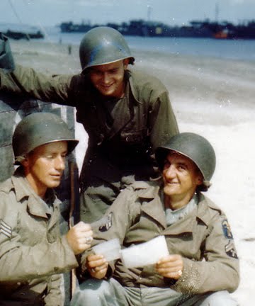 Pictured above is my grandfather Cortland on D-Day (on left). His jacket showed no marks of rank. He's carrying an M1 Garand he picked up from a fallen soldier, because his carbine jammed during the fight. On the right is Donald H. on guard duty. One of the veterans I interviewed, Don served in the 284th Port Company, attached to the 5th Engineer Special Brigade on Omaha Beach. He carries the standard firearm for port company troops, an M-1 carbine. These are Italeri models.The helmet markings worn by the port battalion troops are especially interesting. For the D-Day invasion my grandfather's unit was attached to the 1st Engineer Special Brigade. All attached troops received a blue arc. Below is a color photo of some 1st ESB men on Utah Beach in 1944. Port battalion helmets on Omah Beach received the marking of the 5th and 6th Engineer Special Brigades. There's was a white arc with a blue & yellow amphibious training command insignia underneath. This insignia is visible as a shoulder patch in the photo below.