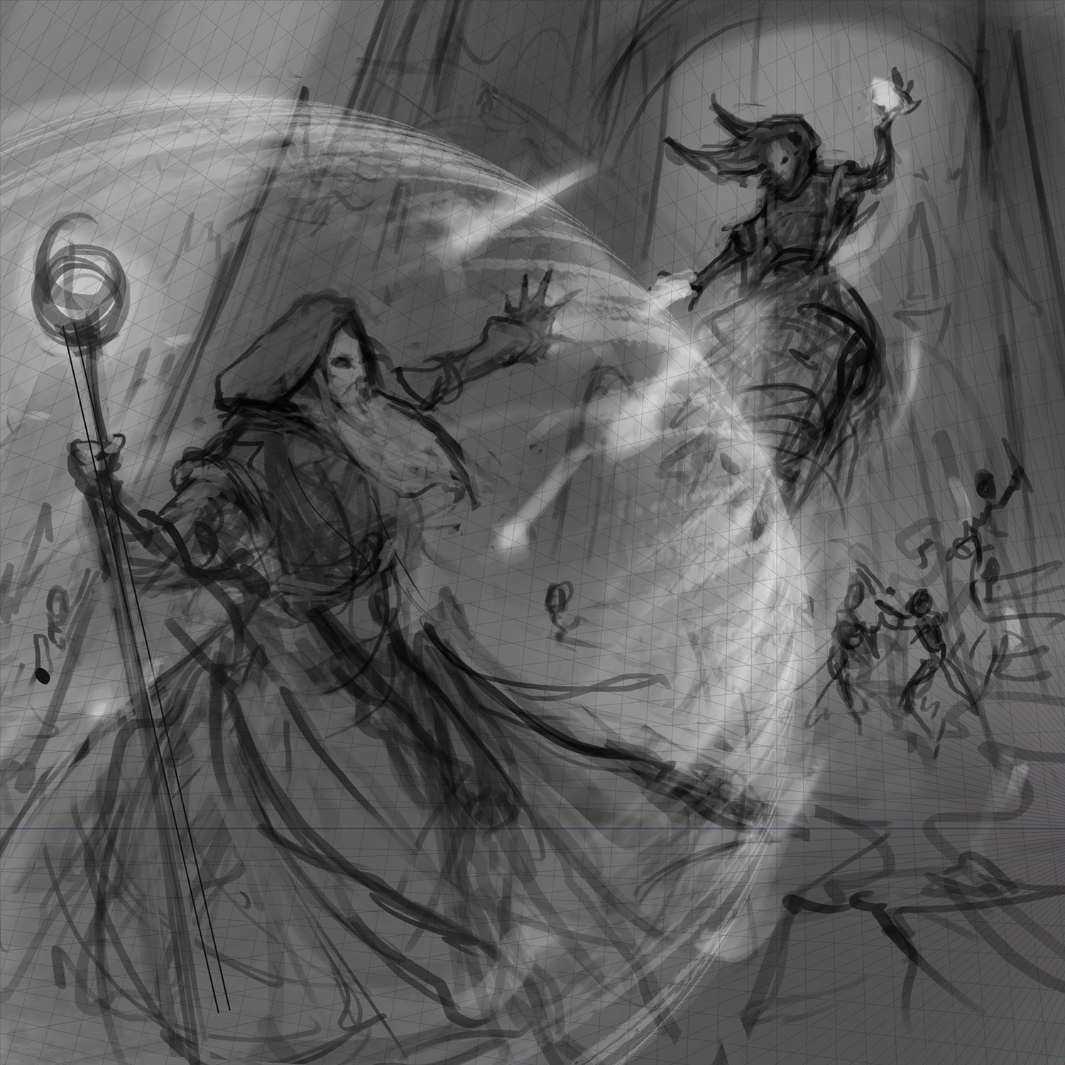 To start, I made a quick sketch in Photoshop, which helped me to visualize the position of the main figures, the perspectives, and the dynamic lines. The Thaumaturge is desperately defending himself from fireballs thrown by the Elementalist floating in the air.