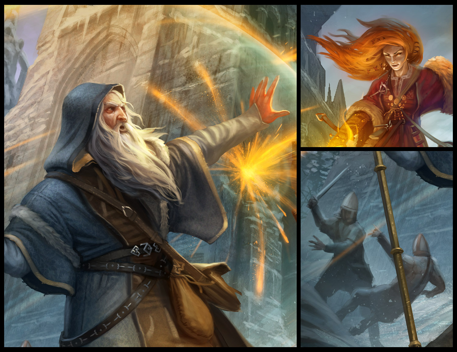 The introduction of colour really brought the piece to life. I especially wanted the contrast between the blue background of the frozen city and the red dress of the Elementalist, to make the wizard look especially dangerous and aggressive. I rendered the soldiers in battle. The