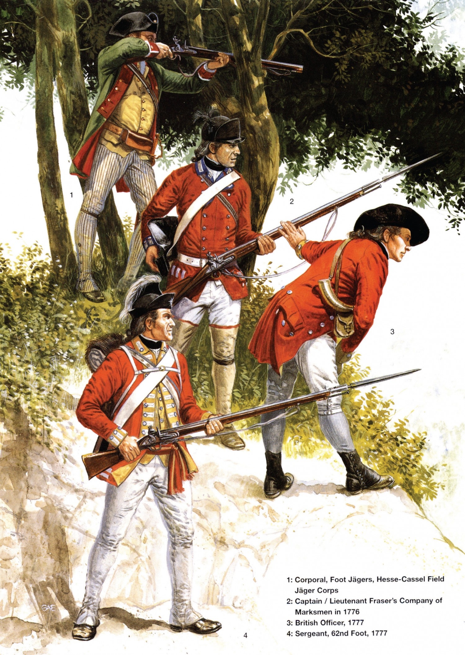 It was Gerry's work in Tradition that led to our meeting, when I was editing, with the weapons historian Fred Wilkinson, a book called The Universal Soldier (Guinness Superlatives, 1971). This needed a series of 14 careful colour plates of soldiers down the ages. Together Gerry and I had the memorable opportunity to actually handle, try on, and photograph such things as reproduction Roman 'Corbridge' armour under the guidance of Russell Robinson at the Tower Armouries, a ringmail shirt, an original buff coat and half-armour, and 19th-century uniforms, and to be 'taught muskets' by the American authority De Witt Bailey. This was a formative experience for both of us, and it strongly coloured Gerry's subsequent approach. His lasting interest in the history of the British redcoat in North America led, in 1976, to a commission to research and paint uniforms and to act as a consultant for the bicentennial American Revolution exhibition sponsored by the London Sunday Times and mounted at the Royal Maritime Museum, Greenwich.