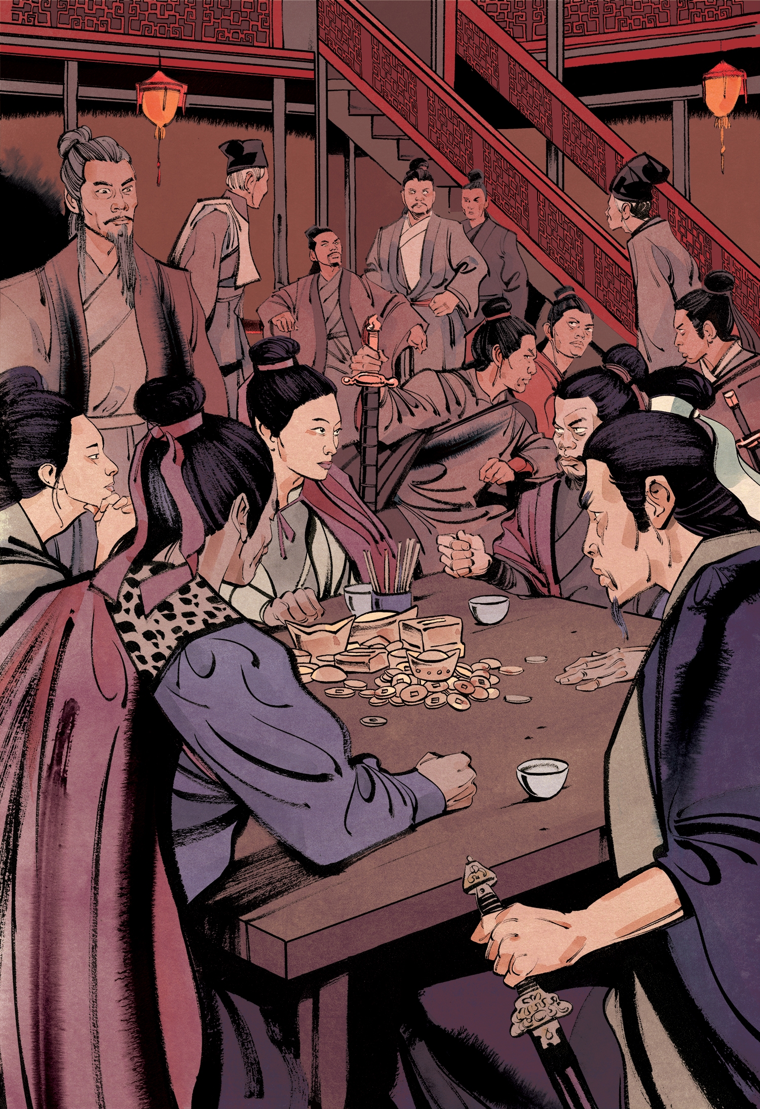 This book is not intended to be an accurate representation of history or culture. While informed by both, its primary purpose is to emulate a certain style of wuxia. We wanted to capture a timeless approach, taking inspiration from Gu Long, Chor Yuen and similar sources. Many of the details in this book are historically accurate, from the setting content to the art, but we gave ourselves the freedom to be creative, and frequently nod to the anachronisms found in classic media, like the 1970s Shaw Brothers martial arts films, or the wuxia television series of the 1980s. For example, some costumes, plot details, or hair styles might not be historically grounded, but fit the glamor or sensibilities of the time period of the source of inspiration.