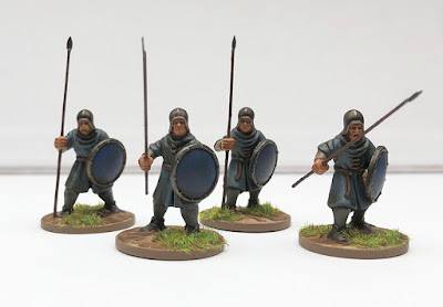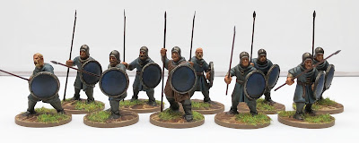 Having completed the officer alongside the last batch, this lot are just four rank-and-file grunts - two for a nominal front rank (spears lowered), and two for a rear rank with spears grounded. Here's the full unit in all it's glory...