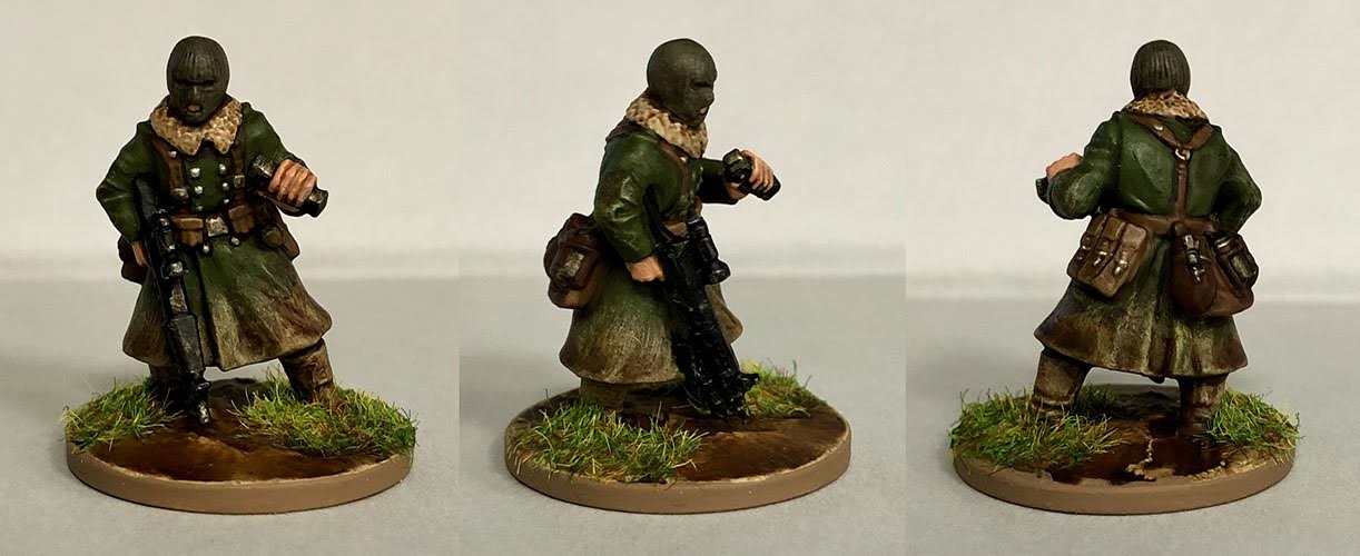 This guy is, hands-down, my favourite of the bunch. At first, I worried that it was a little too close to the pose of the original Stalker, but it ended up coming together perfectly. The balaclava head is from the special forces sprue, and didn't sit particularly well on the WWII body, so I went to the green stuff and added a fleece collar. This bulked out the shoulders a bit, and blended the head into the body, while also giving a bit of pop to a mini that might have come out a little dull otherwise (due to the grey balaclava). The AK has had the magazine clipped off, while the spare mag in the left hand was originally intended for an StG 44.